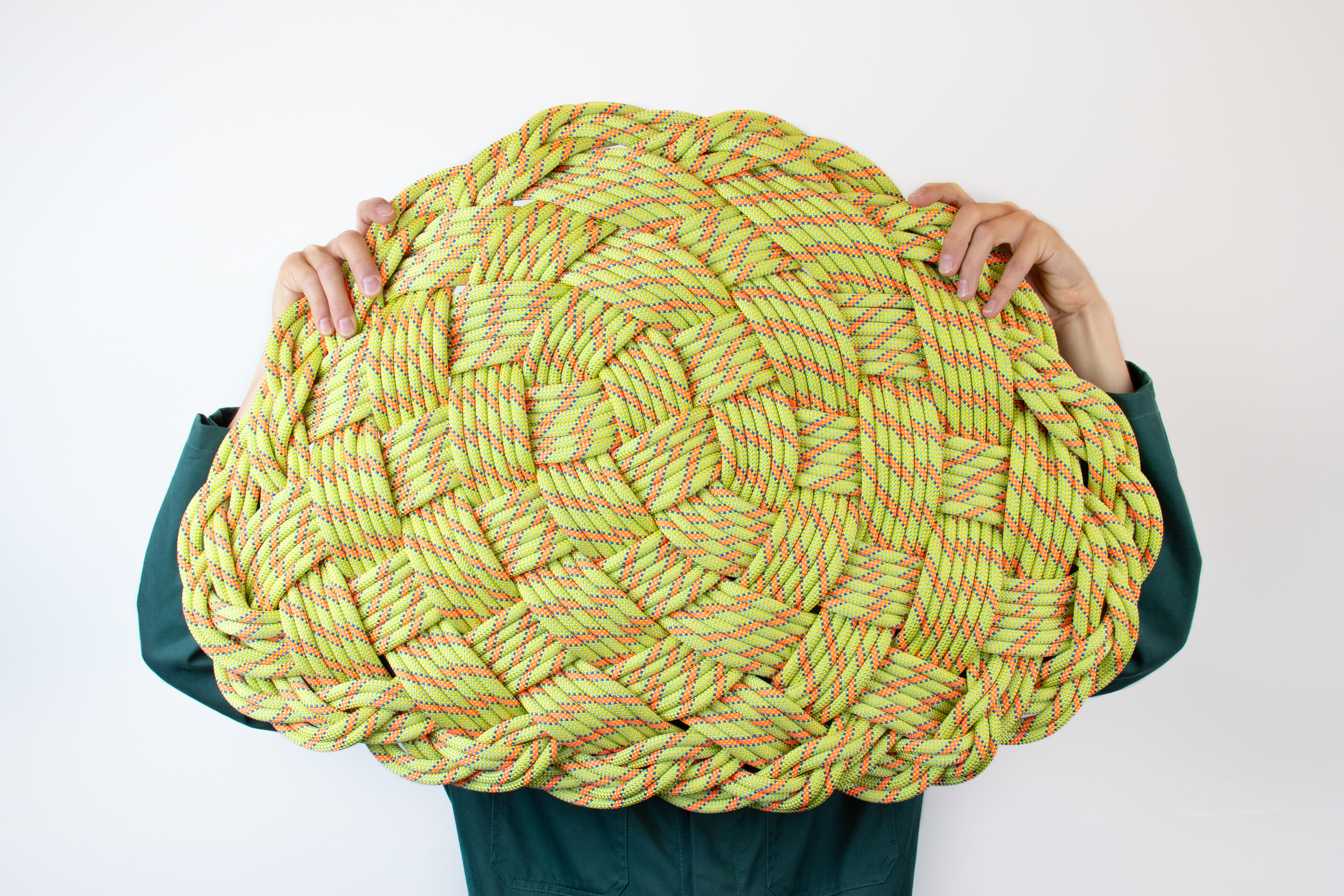 While wandering the streets of Tokyo, I kept spotting this vibrant yellow-and-black rope—love at first sight. I brought a bundle back to my studio and transformed it into a large-scale knotwork piece