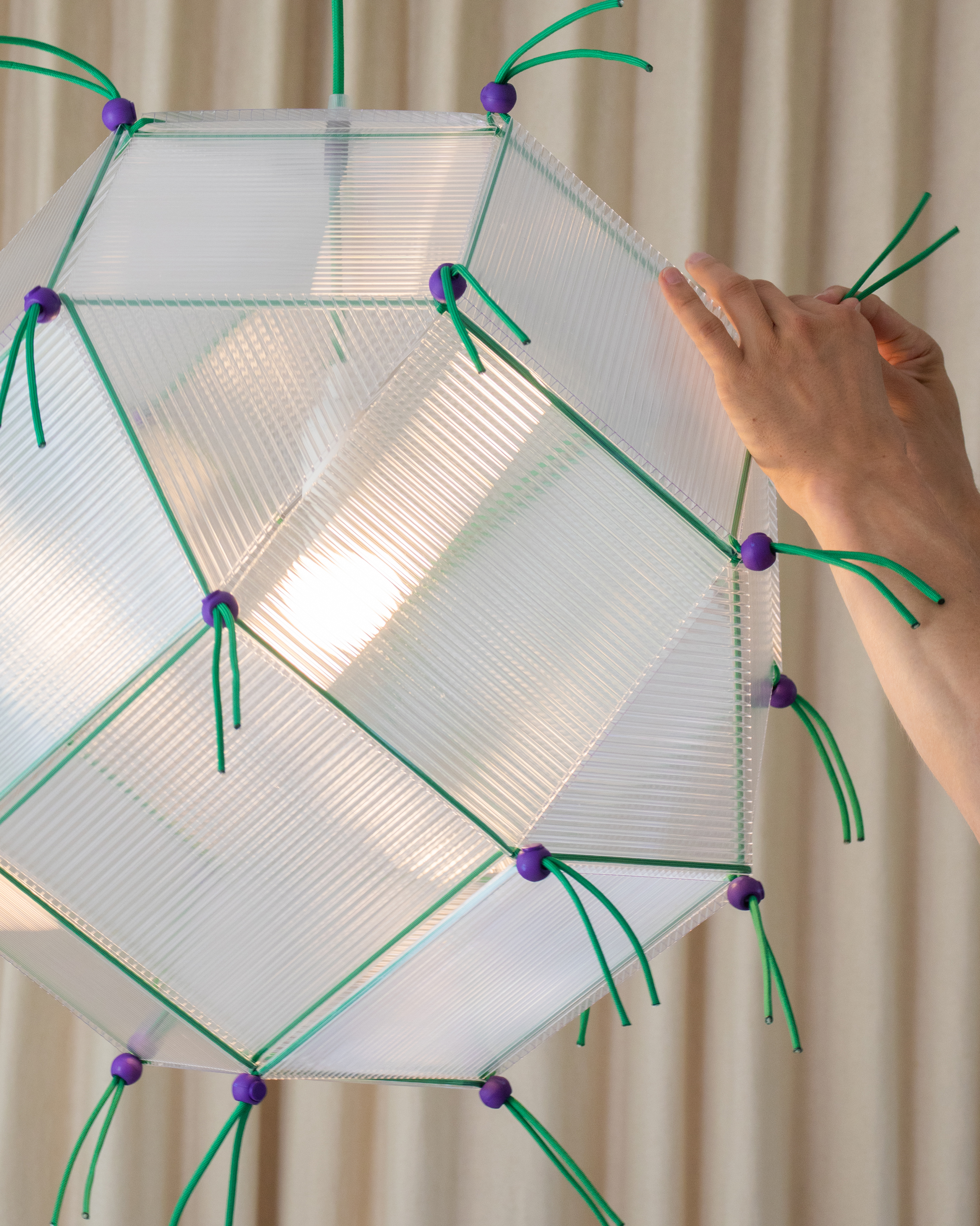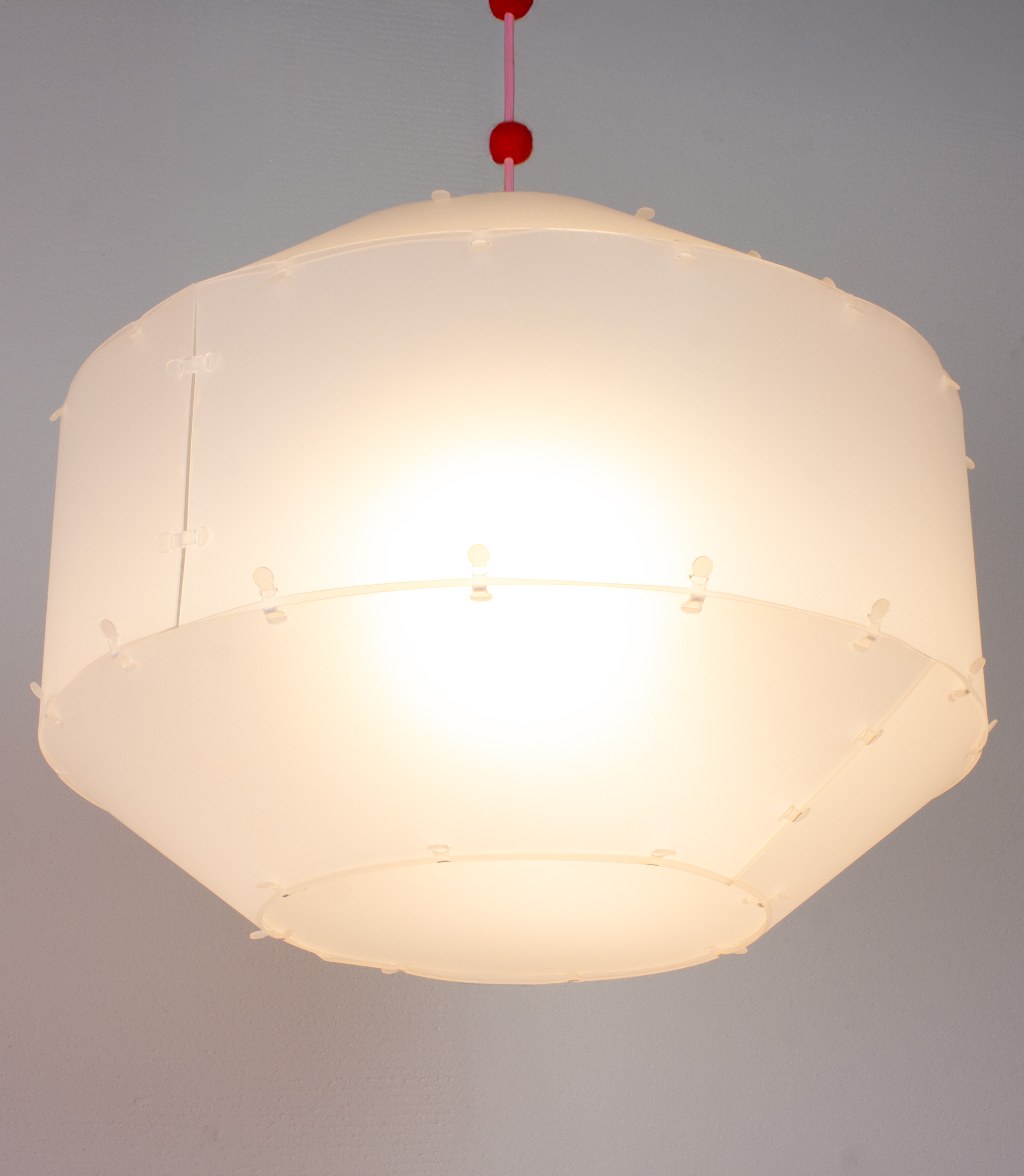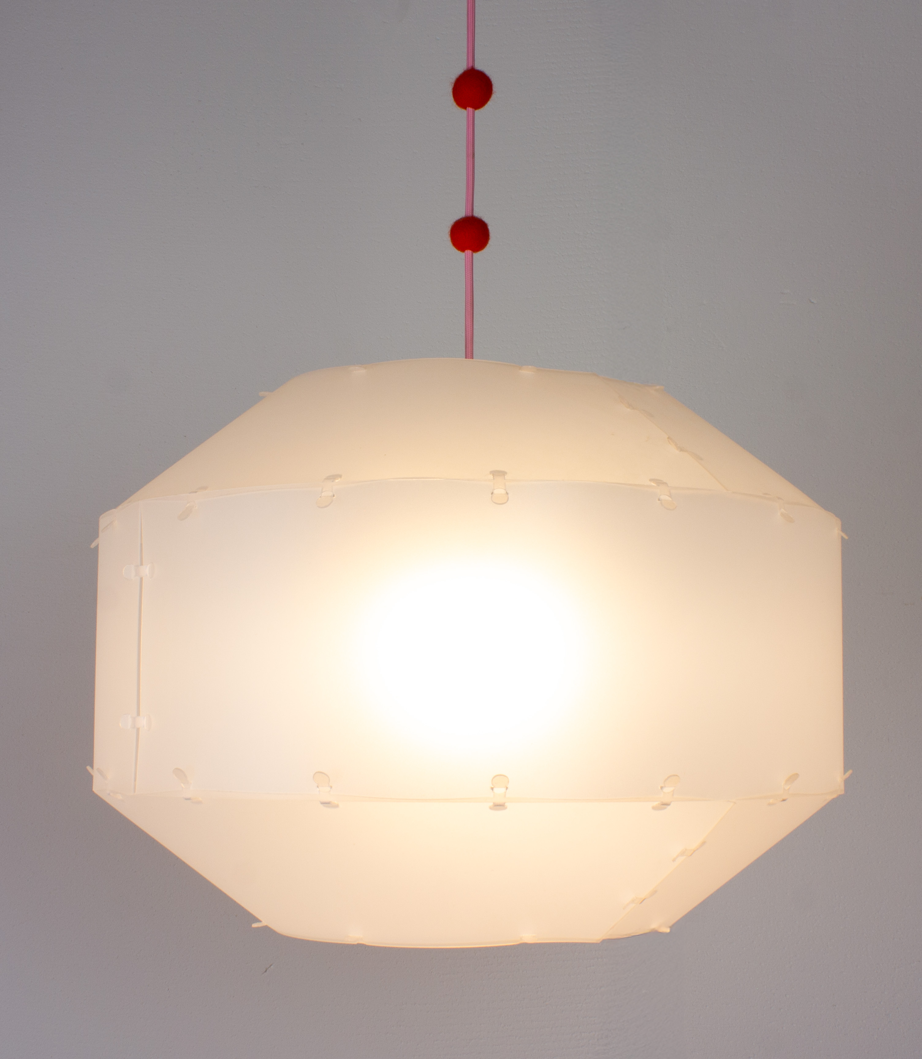 Built from 18 squares and 8 triangles, this light is a Rhombicuboctahedron. The idea sparked while I was cutting up a leftover plastic sheet.