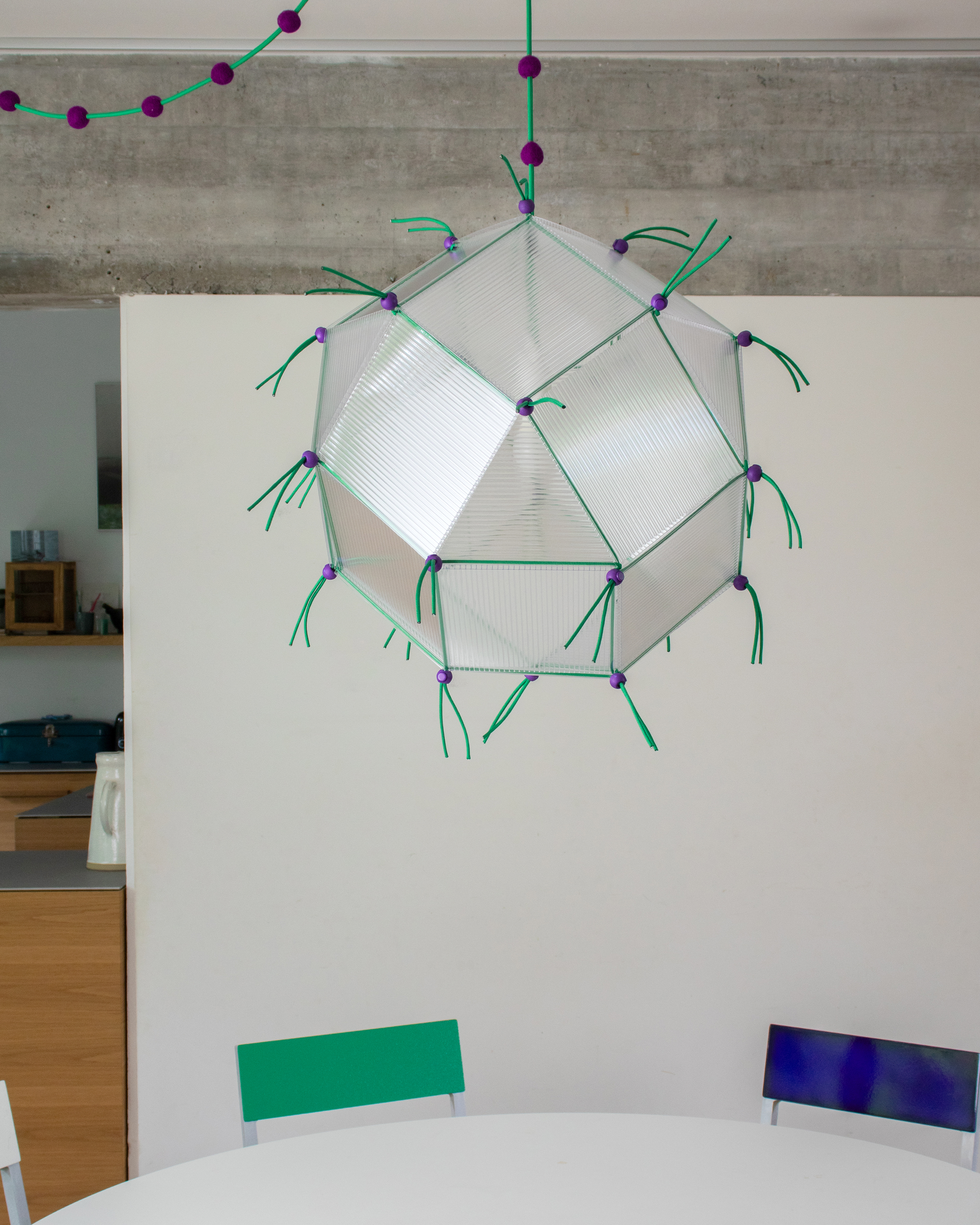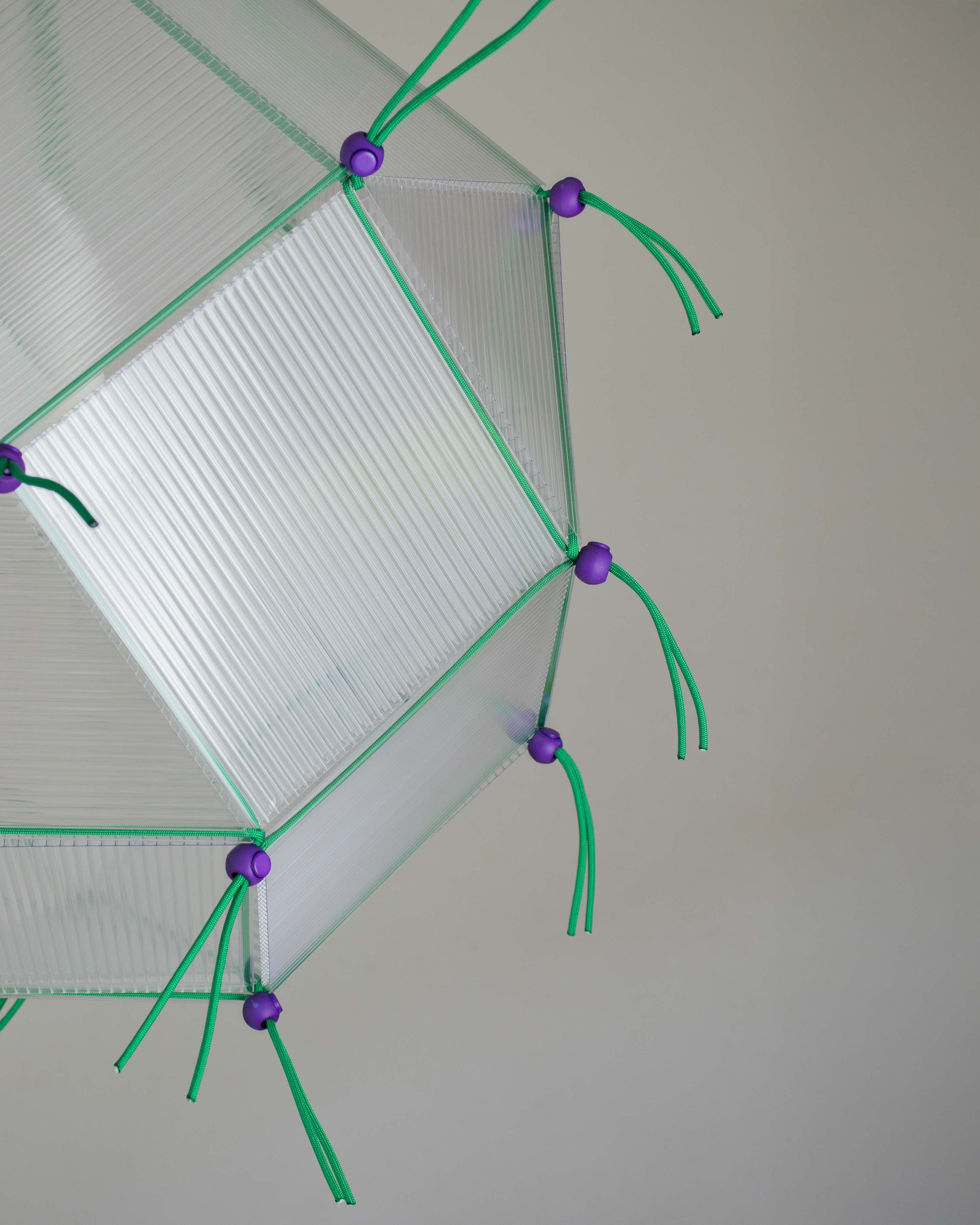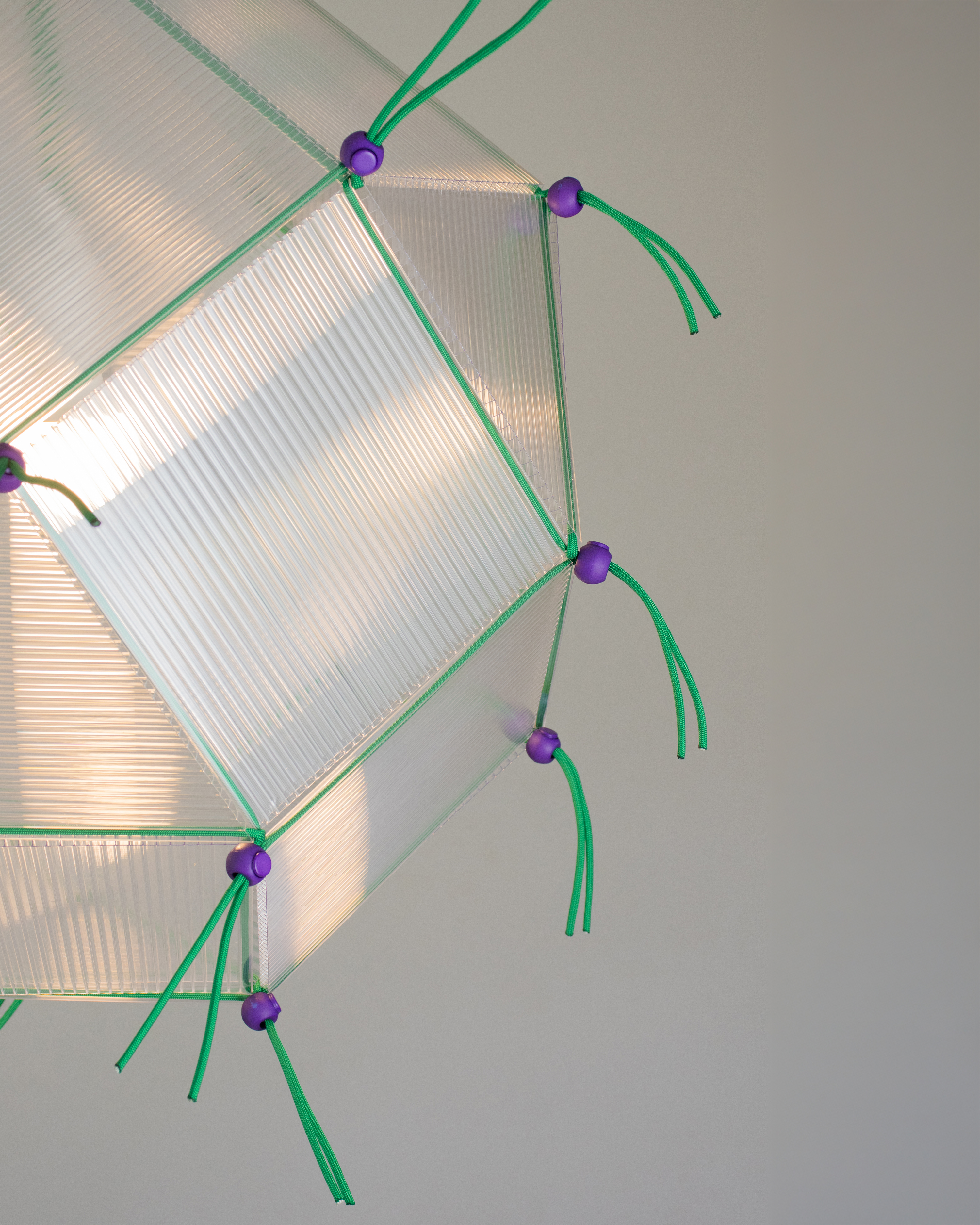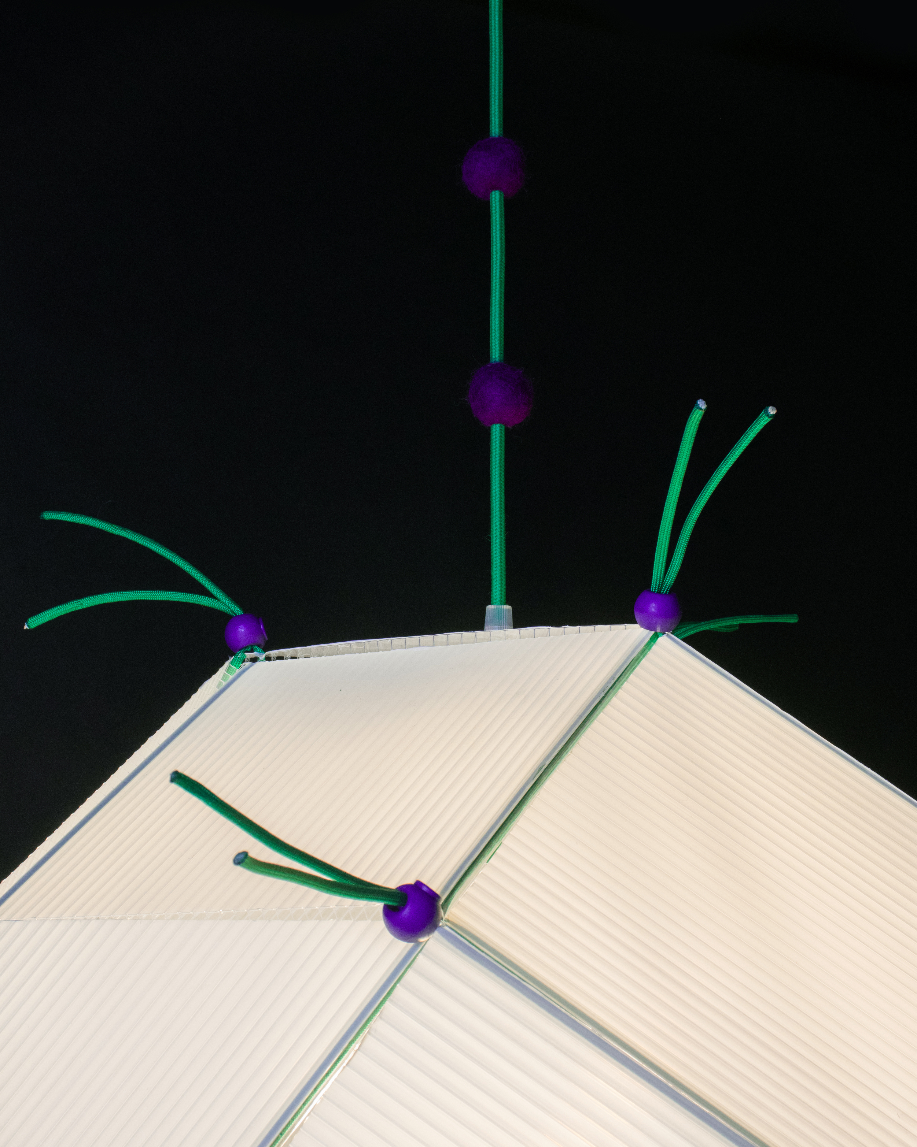Built from 18 squares and 8 triangles, this light is a Rhombicuboctahedron. The idea sparked while I was cutting up a leftover plastic sheet.